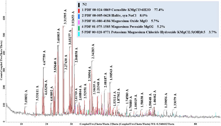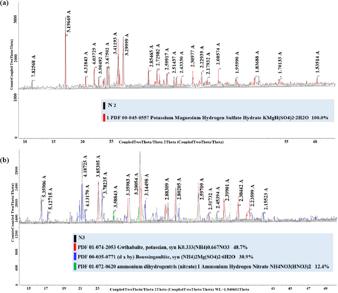 The mother liquor was ammoniated to pH = 6 to obtain a neutral product and dry; as a result, the potassium-nitrogen-magnesium salt crystallises, and double salts are identified by the XRD analysis shown in Fig. (11b). The obtained salt does not contain insoluble impurities and chlorine and consists of potassium ammonium nitrate and magnesium ammonium sulphate. Its chemical composition is shown in Table 6.