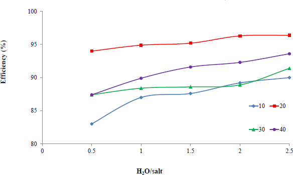 Dependence of washing degree on the water: salt ratio under various process times (min).