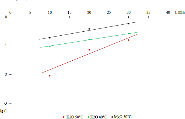 Kinetics of washed potash ore decomposition with 10% nitric acid was preliminarily studied. As the results show, equilibrium in the system for potassium and magnesium is achieved within 30 minutes [26]. To calculate the kinetic parameters of the decomposition process in the interval of 10-30 minutes, an order of main reactions (1) and (2) and rate constants were determined, taking into account the experimental values of K2O and MgO content. Their contents are given in Table 5.