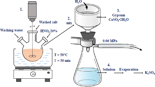 To separate the insoluble calcium sulphate and to reach complete dissolution of potassium and magnesium sulphates, which are the target components for obtaining the mineral fertiliser, chemical conversion methods are required. The chemical composition of raw materials presented in Table 4 suggests that the main water-soluble components are potassium and magnesium sulphates bound to an insoluble calcium sulphate. To extract them from ore into water-soluble compounds, the process of dissolving the washed potassium ore with the nitric acid solution was studied [26]. The process is described in the main reaction Eqs. (1 and 2):