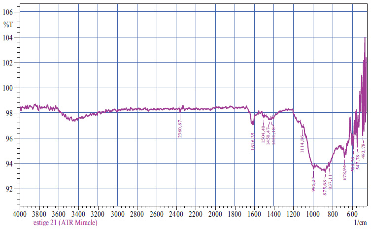 The analysis of the obtained absorption spectrum of the phosphate siliceous shales sample was characterized by intense peaks at 493.78, 547.78, and 678.94 cm-1, corresponding to Ca-O-P compounds. The absorption spectrum in the range of 837.11-995.27 cm-1 indicated characteristics of Si-O bond fluctuations. Furthermore, wave oscillations in the region of 1114.86-1431 cm-1 corresponded to Si-O-Al valence bonds, and non-intense peaks in the region of 1616.35-2360.87 cm-1 indicated characteristics of O-H bonds.