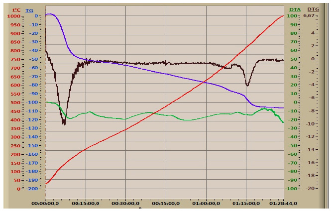 Thermal analysis of the initial samples of phosphate-siliceous shales and oil sludge was carried out on a derivatograph of F. Paulik, D. Paulik, and L. Erdei systems (“MOM”, Hungary). The shooting was carried out in an air environment, in the temperature range of 20-1000°C and in a dynamic heating mode at dT/dt = 10. Calcined Al2O3 weighing 500 mg was used as a reference substance, with a scale sensitivity of 500 µV to measure the weight change of the sample. The sensitivity of other measuring systems of the device was as follows: DTA=250 µV, DTG=500 µV, TG=500 µV, and T =500 µV.