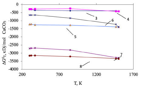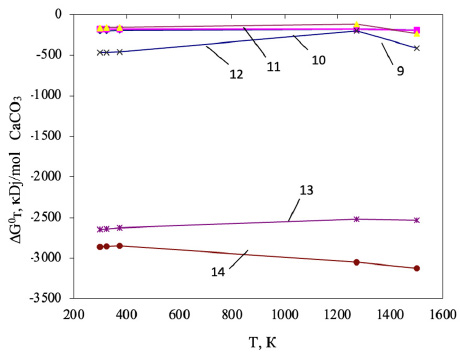 Decarbonization reactions of calcium carbonate with the formation of aluminate in the presence of the above-mentioned carbon compounds are thermodynamically probable, as evidenced by negative Gibbs energy values in the temperature range under study (Fig. 6).