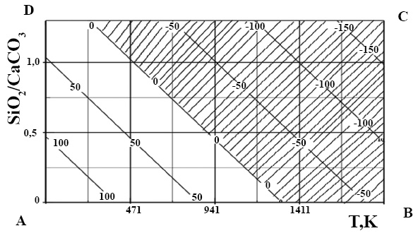 The results of mathematical planning for decarbonization of the working charge at SiO2/CaCO3 mass ratios from 0.3 to 1 in terms of Gibbs energy corresponded to the response surface -(∆GTo) interaction of the components. The significance test, according to the Student's criterion, demonstrated that all coefficients turned out to be significant and were characterized by minor deviations in experimental and calculated data. The use of Fisher’s criterion confirmed the adequacy of the mathematical model. These data were confirmed by volumetric graphical dependencies along the A-B-C line and then in the A-B-C-D region. Moreover, with an increase in the SiO2 content in the charge, the temperature at the beginning of decarbonization decreased.