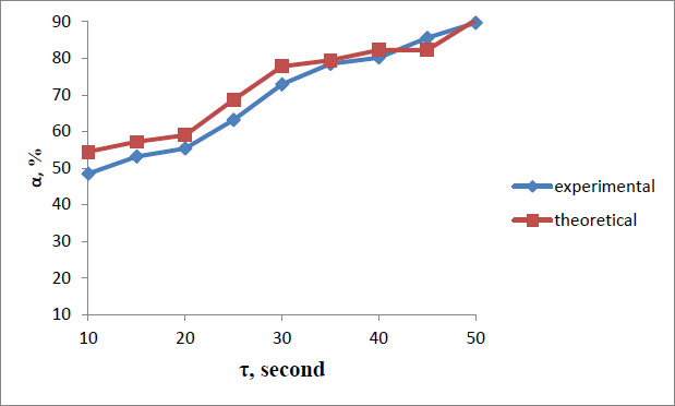 Comparative results of experimental and theoretical data showed slight deviations in the data of the degree of sorption (α) at a process duration of 35-50 seconds (Fig. 3). The analysis of the obtained graphical dependencies showed that an increase in temperature, the flow rate of the liquid under study, and the duration of sorption contributes to an increase in the degree of lithium chloride release on the sorbent.