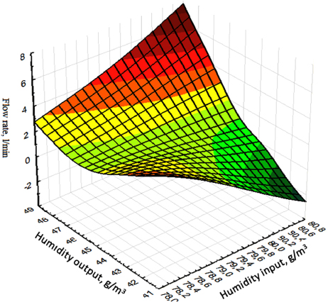 Mathematical modeling of the sorption process was carried out using the STATISTICA program (version 10.0) developed by StatSoft [21]. The technological parameters of the process, such as temperature, flow rate, and inlet and outlet humidity, are determined based on the volumetric graphical dependences of lithium chloride release obtained under experimental conditions.