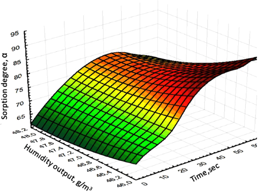 Three-dimensional dependences of the degree of sorption of lithium chloride on the proposed sorbent showed the possibility of maximum release up to 90% with a decrease in humidity to 46% at the outlet and a duration of 70 s.
