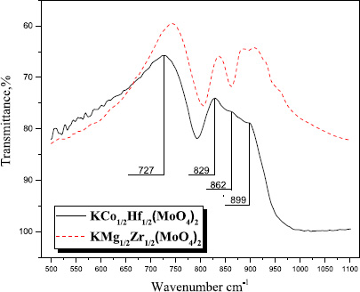 IR spectra of KCo1/2Hf1/2(MoO4)2 и KMg1/2Zr1/2(MoO4)2 [30].