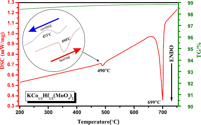 The DSC curves recorded from KCo1/2Hf1/2(MoO4)2 are shown in (Fig. 4). Upon heating the sample, two endothermic signals were observed at 490°С and 699°С. The endothermic peak at 699°С indicated the melting point of KCo1/2Hf1/2(MoO4)2. No weight loss was observed on the TG curve.
