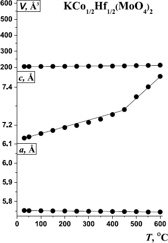 The coefficient of thermal expansion (CTE) αc was 47×10–6 °С–1 up to 450°С and 156×10–6 °С–1, while αa remained negative at –2.3×10–6 °С–1 throughout the investigated temperature range. Despite this, no reduction in cell volume was observed. The values of αV for KCo1/2Hf1/2(MoO4)2 were 43×10–6 °С–1 at room temperature and 148×10–6 °С–1 at 600°С. These values are close to those calculated for the isostructural analogue KMg0.5Zr0.5(MoO4)2 (αV = 160×10–6 °С–1 at 500°С [30]).