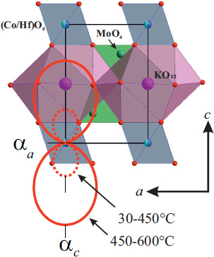 Projection of the KCo1/2Hf1/2(MoO4)2 structure on the ac plane, mapped to the thermal expansion tensor cross-section.