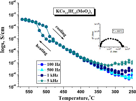 The electrophysical properties of the examined ternary molybdate were also characterized. The temperature dependence of conductivity (in a heating-cooling cycle) at various frequencies and the impedance plot, which is typical for ionic conductors, are presented in Fig. (7).