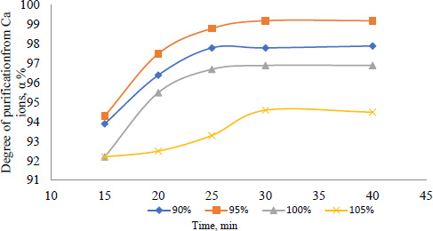 The results of the salt purification process, as they pertain to the removal of calcium and magnesium ions, are illustrated in Figs. (1 and 2). In order to ascertain the optimal stoichiometric quantity of sodium phosphate to be employed, the degree of purification at 90, 95, 100, and 105% stoichiometry was evaluated. The addition of sodium phosphate in a 1:1 ratio or greater (i.e., 100% or 105%) results in the presence of 0.1-0.3% phosphate ions in the purified solution, accompanied by a discernible decline in the degree of purification of calcium and magnesium ions. The optimal mixing time is 25 to 30 minutes.