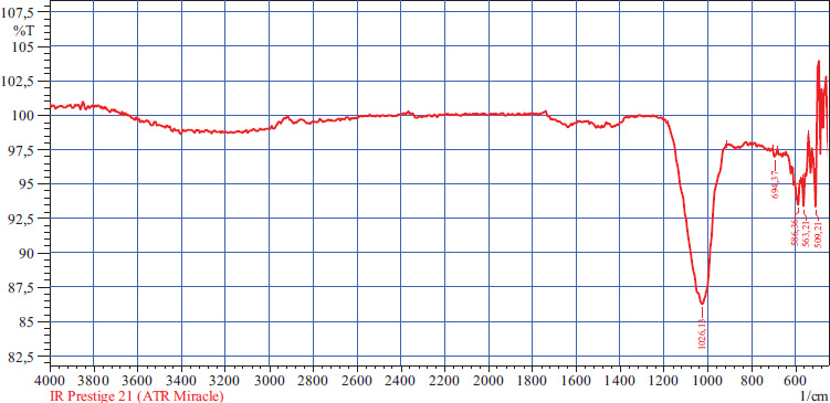 IR spectroscopic analysis of the percipitate formed from the salt filtrate after the addition of sodium phosphate revealed a distinct absorption band in the region of 1000–1026 cm-1, indicating the presence of a calcium phosphate (Ca–P–O) bond. Single aspects in the 509-589 cm-1 region are characterized by the mineral component of calcium phosphate in the form of Si-O-P Si-O-Mg valence bonds.