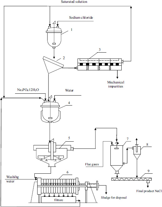Table salt from the lake is loaded into the mixer (1) and washed from mechanical impurities by circulating saturated solution at a temperature 20-25°C for 30 minutes at mass ratio solution:salt=3:1. The obtained suspension is separated by screening in the (2), the solution with mechanical impurities is separated on the nutch-filter (3), the solution is returned to sodium chloride salt washing. The washed ore is dissolved with water and washing water from the filter press to saturation in the reactor (4) at a temperature of 25°C, then sodium phosphate is added to the solution in an amount of 95% of stoichiometry to p is characterized by precipitate impurities of calcium and magnesium. The obtained suspension is sedimented in a settling tank (5), and the thickened pulp with impurities is washed on a filter press (6). The water-washed and squeezed sludge is sent for disposal, and filtrate and washing water are returned for mixing and salt dissolution in the reactor (4).