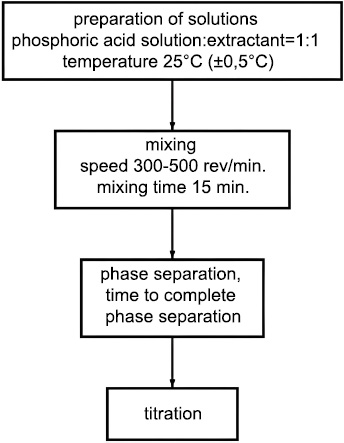The extraction of phosphoric acid was conducted with a volume ratio of phosphoric acid to extractant of 1:1 at a temperature of 25°C, maintained in a water thermostat with an accuracy of ± 0.50°C. Equal volumes of the aqueous and organic phases were placed in separating funnels mounted on a disk in the thermostat. The stirring speed was set between 300 and 500 rpm and continued until equilibrium was reached, which took 15 minutes in these experiments. After stirring, the funnels were left in the thermostat until the phases had completely separated. To determine the acid concentration, samples were taken from both the organic and aqueous phases, diluted with water, and titrated with 0.05N NaOH using phenolphthalein as an indicator. If sulfuric acid was present, titration was performed with both methyl red and phenolphthalein. The distribution factor was calculated as the ratio of the equilibrium concentrations in the organic and aqueous phases, respectively.