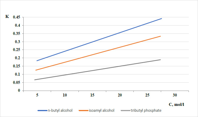 As illustrated in Fig. (2), an increase in the initial concentration of phosphoric acid (from 5.38% to 25.61% P2O5) leads to a higher distribution factor (K=Corg./Caqe) at 25°C. The distribution factor increases from 0.178 to 0.436 for n-butyl alcohol, from 0.06 to 0.183 for isoamyl alcohol, and from 0.120 to 0.320 for tributyl phosphate.