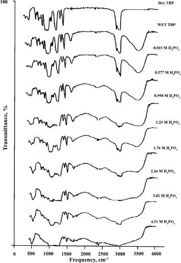 During the extraction of phosphoric acid with tributyl phosphate, increasing the acid concentration (up to 2.24 mol/L) leads to a decrease in the intensity of the bands associated with the phosphoryl group. As the concentration increases further, the bands corresponding to water vibrations disappear. This can be explained by the formation of a hydrate-solvate complex during extraction from dilute phosphoric acid solutions, where water is abundant. In such cases, water molecules are incorporated into the extracted complex along with tributyl phosphate. However, as the acid concentration rises, the activity of water in the aqueous phase decreases, reducing the hydration of the extracted complex. At higher concentrations, the complex becomes dehydrated, resulting in the disappearance of water-related bands in the spectra.