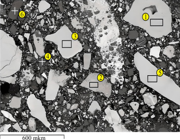 According to micro-X-ray spectral analysis, the color of the grains of ferromanganese ore is heterogeneous, varying from gray to brownish with inclusions of oxides Mg, Al, Si, K, Ca, Ba (Fig. 2). According to the results of microrentgenospectral analysis, ferromanganese ore has a rather complex textural and structural pattern. In the spectra of particles 1 and 2, iron oxides (the atomic fraction of iron is 53.8 – 55.9%) with a small amount of manganese and silicon are detected. The presence of barium oxide along with manganese oxides is also observed in the ore (Table 1).