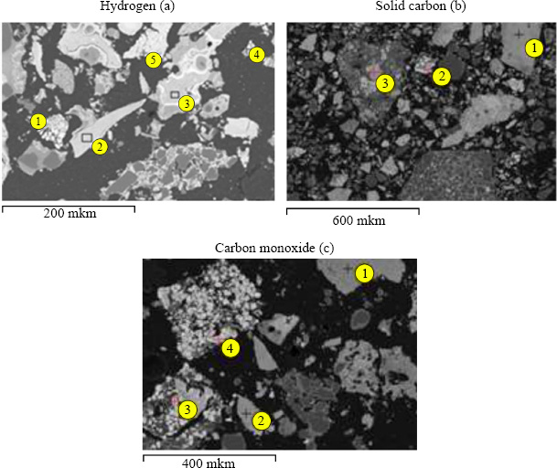 Type and composition of phases in ferromanganese ore after reduction firing: a – at 900 ° C and exposure for 30 minutes in an atmosphere of hydrogen; b – at 900 ° C and exposure for 90 minutes in contact with solid carbon; c – at 900 ° C and exposure for 90 minutes in an atmosphere of CO.