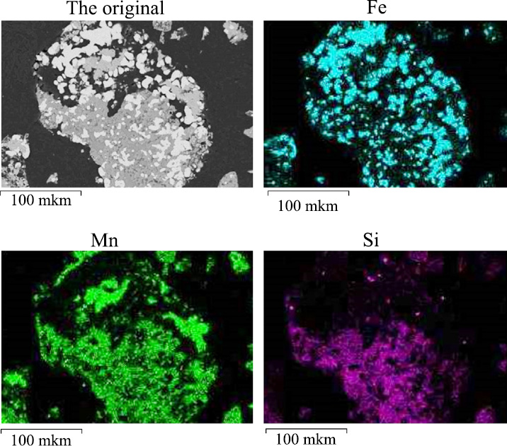 The results of the study of the distribution of iron and manganese between phases during solid-phase reduction are confirmed by the data presented on the concentration maps of these elements in the reaction products (Fig. 4). Analysis of these maps allows us to conclude that during the reduction of hydrogen in the atmosphere, almost all iron passes into the metallic phase, while manganese remains outside the metal particles. The distribution of phosphorus on the maps appears to be uniform and does not show any obvious patterns, which is probably due to its low concentration.