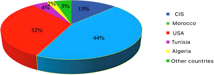 In the CIS, the main producers of phosphorus-containing and feed phosphorites are Kazakhstan, Russia, Uzbekistan, Ukraine, and the Baltic States (13%). The resources of phosphorous raw materials in the CIS countries are represented by exploratory forecast reserves. In terms of their number, the CIS ranks third in the world, second only to Morocco (44%) and the USA (32%). The proven reserves amount to about 2 billion tons of P2O5. They are concentrated in Kazakhstan (35.3%), Northwestern (35.2%), Volga-Vyatka (14.7%), Central (3.8%), East Siberian (6%), and other economic regions of Russia, as well as they are also present in Central Chernozem (0.6%), Volga (0.1%), Ural (0.3%), West Siberian (1.1%) regions of Russia, and Estonia (3%). The estimated reserves in the CIS are about 8.1 billion tons of P2O5 (Fig. 1) [28, 39].