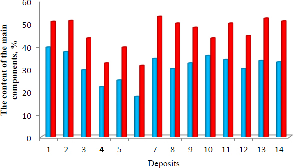 Analysis of the obtained diagram showed that in the CIS countries, rich phosphorous concentrates are characteristic of the Khibinsky, Kovdorsky, and Kingisepp deposits. Jordanian, Vietnamese, Mongolian, and Moroccan phosphorous concentrates are slightly inferior in terms of the content of the main component P2O5. The CaO content in all the studied deposits ranges from 44 to 52%. Phosphatide concentrates from the Karatau and Chilisai deposits are lower in both the content of the main components, P2O5 and CaO, than in the CIS countries and new deposits in the African and Asian regions [6].