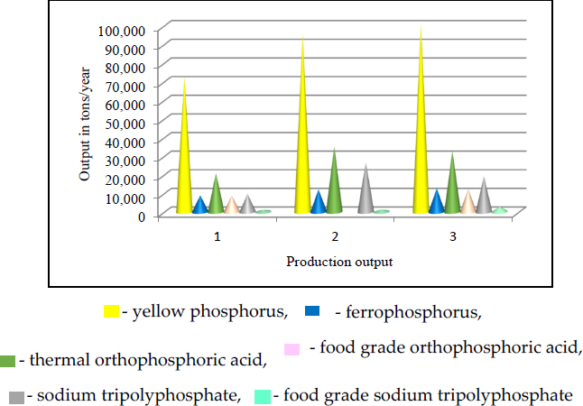 Comparative information on the production of the main product of yellow phosphorus and its compounds at the NDPP in the period 2017-2019 showed that the output of the main product, thermal phosphoric acid, food grade orthophosphoric acid, and food grade sodium tripolyphosphate is steadily increasing. These facts reflect the high demand for the plant's products for the main types of products in both domestic and foreign markets [2, 37]. Fig. (4) shows the data on the actual output for 2017-2019.