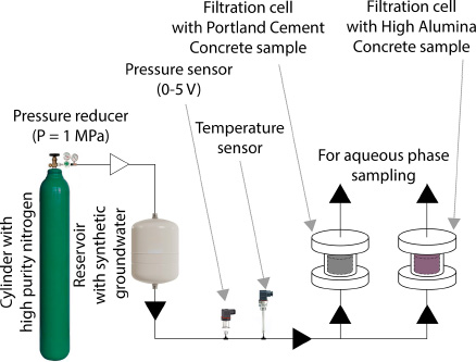 To obtain filtrates of a synthetic groundwater solution, a laboratory setup was constructed. In this experimental setup (Fig. 1), a synthetic groundwater solution of the crystalline rocks of the Yeniseisky site was passed under a pressure of 1 MPa through the filtration cells containing concrete samples with a diameter of 47 mm and a height of 31 mm [47]. A preliminary purge of all units of the setup and injection of the necessary pressure in the system was carried out using a cylinder with nitrogen of high purity (99.9999%). The use of compressed air, unlike nitrogen, will lead to the inevitable passivation of the mineral surfaces of concrete due to the interaction of atmospheric CO2 with portlandite (Ca(OH)2) with the formation of calcite (CaCO3), which will lead to a decrease in the pH of the filtrate and distortion of the experimental results [48].